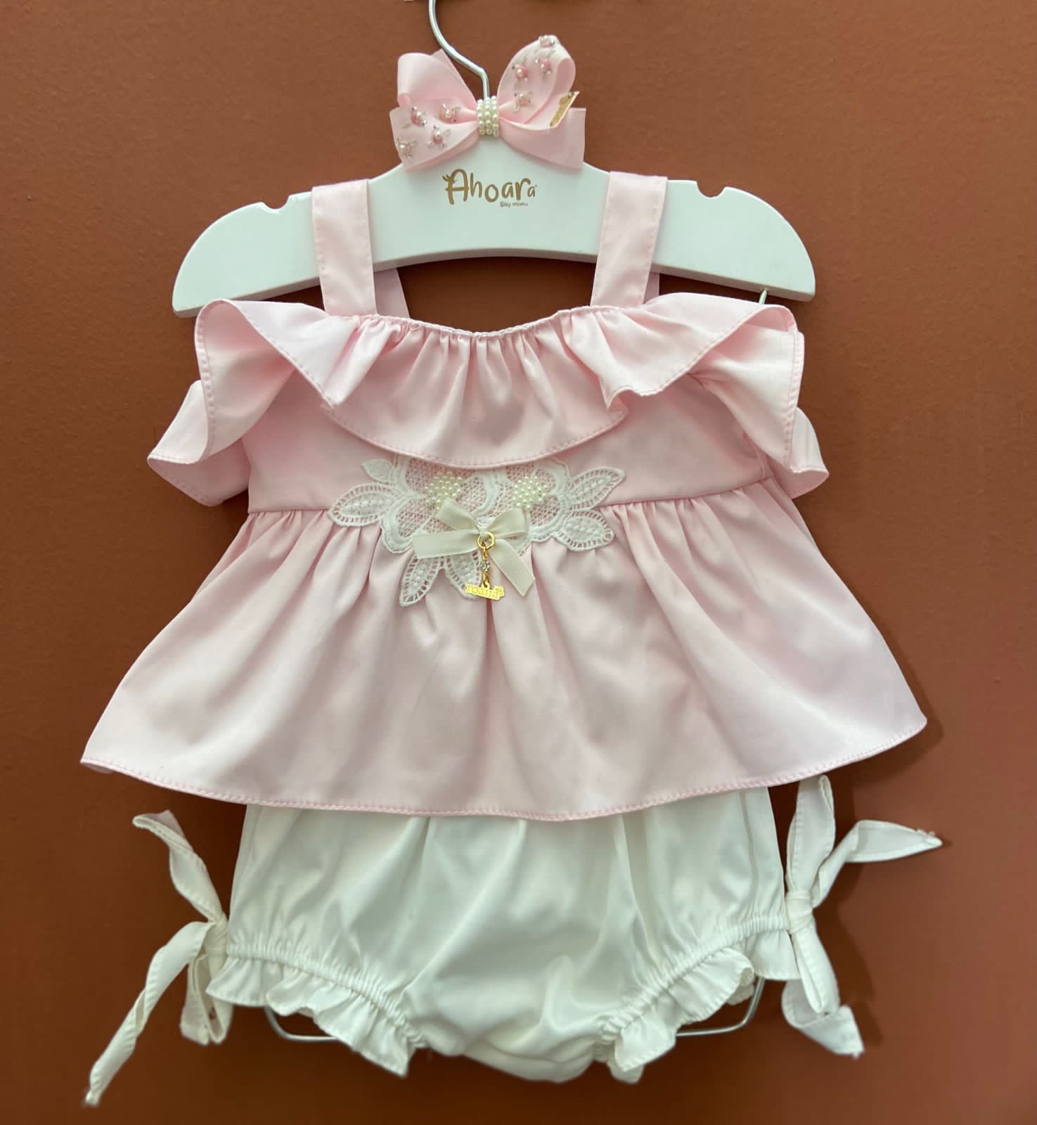 Conjunto Infantil Bata com Culote ou Short Flores e Cetim Rosa Roana