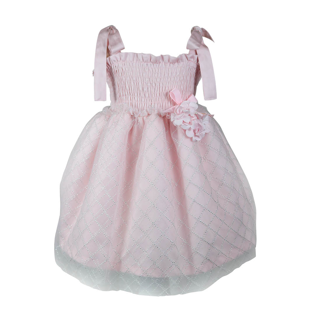 As alças de fita formam laços graciosos nos ombros, trazendo um toque encantador e permitindo um ajuste perfeito. O corpo em elástico drapeado oferece conforto e um caimento impecável, enquanto flores delicadas na cintura, no mesmo tom do vestido, adicionam um detalhe refinado. A saia é o grande destaque, com brilhos sutis espalhados por toda a peça, conferindo um toque mágico e encantador.