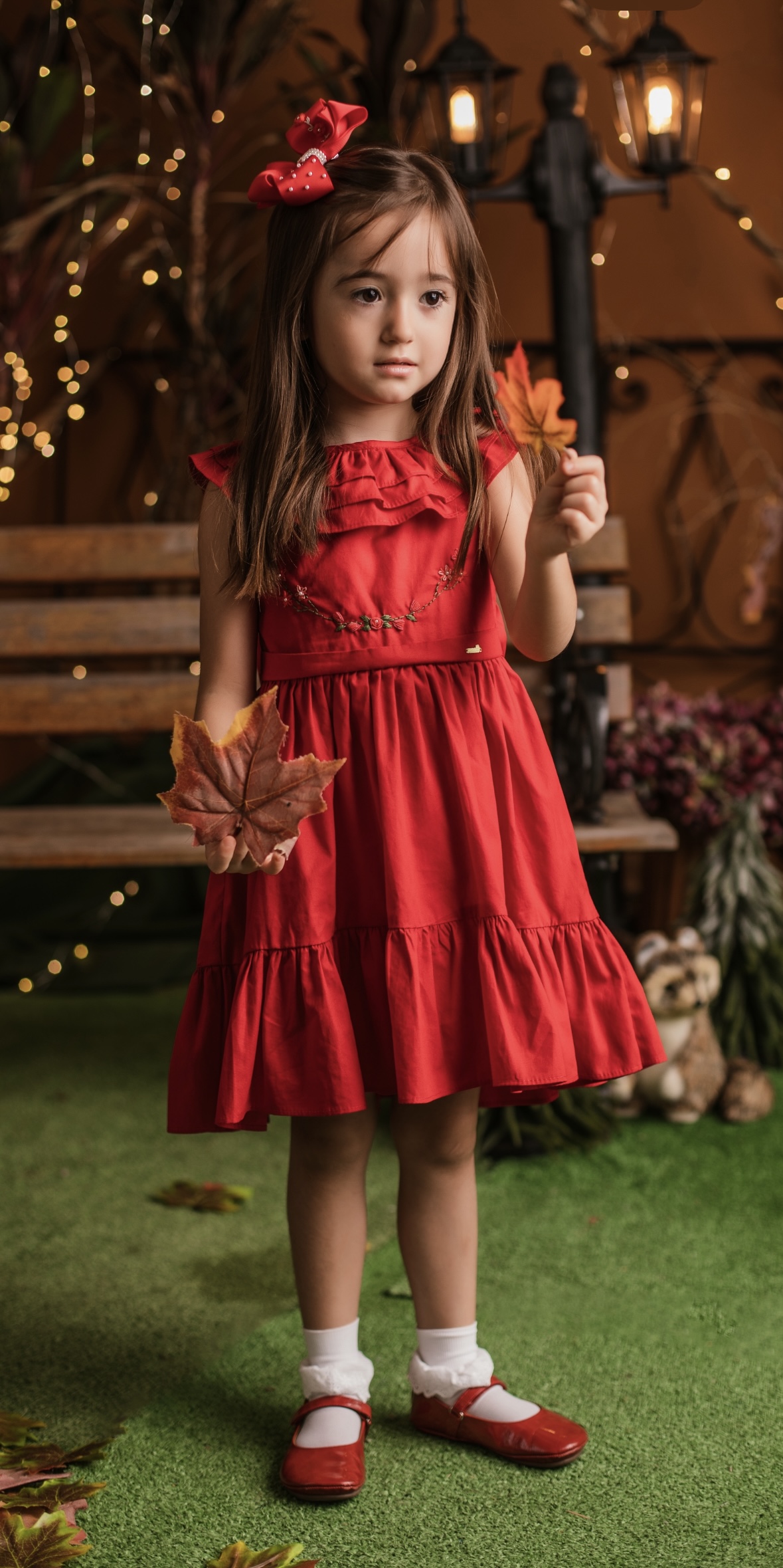 Confeccionado em tecido de alta qualidade, o vestido oferece um caimento perfeito e confortável. O destaque da peça fica por conta do bordado delicado no corpo do vestido, com pequenas flores e pérolas em cada florzinha, criando um efeito sofisticado e encantador. A gola com babado arredondado complementa o design com um toque de charme. O tom vibrante de vermelho remete à personagem de Chapeuzinho Vermelho, enquanto o modelo cavado proporciona liberdade de movimento e um visual moderno. Nas costas, um laço de fita satinada adiciona um toque final de elegância, criando um visual encantador.
