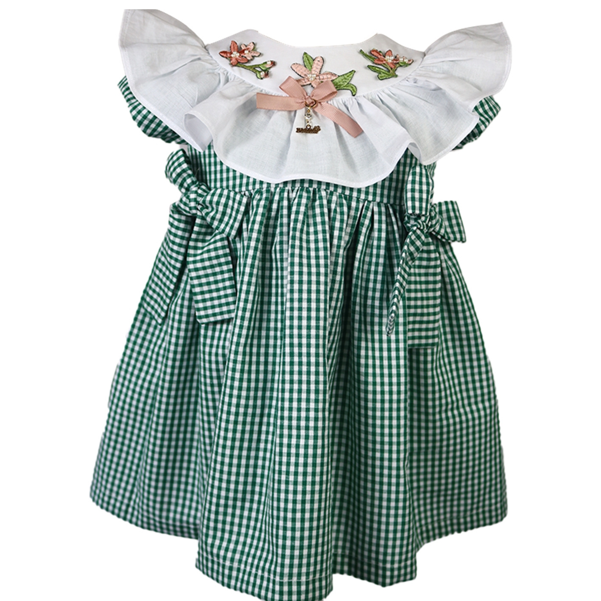 O xadrez vichy é um clássico da moda infantil, remetendo a um estilo europeu sofisticado que nunca sai de tendência. A combinação do verde com os detalhes bordados à mão na gola branca cria um contraste harmônico, garantindo uma aparência fina e delicada. Esse padrão traz um toque campestre e ao mesmo tempo refinado, perfeito para ocasiões especiais.