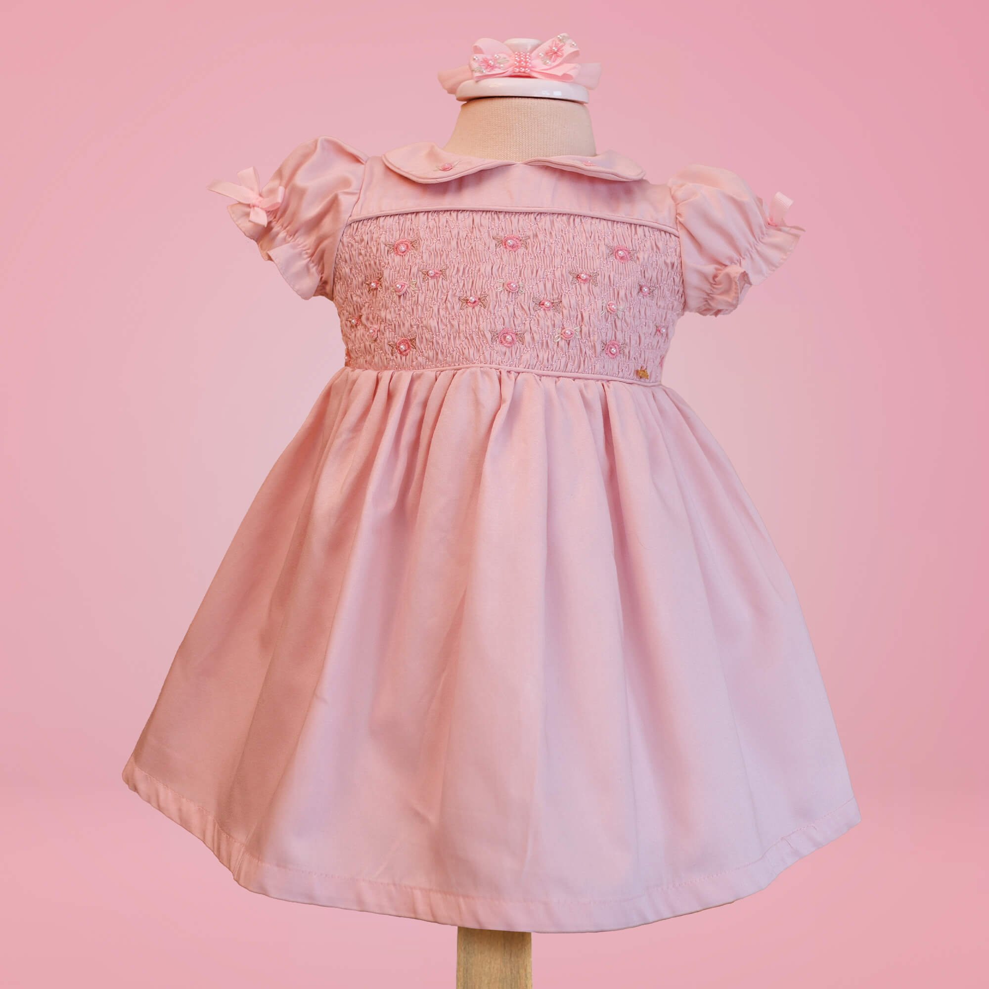 Confeccionado em tecido de alta qualidade, o vestido tem um caimento perfeito que destaca a beleza e o conforto da criança. O tom de rosa seco, suave e sofisticado, confere à peça um ar atemporal, enquanto os detalhes delicados na parte superior, como a aplicação de bordado fino, adicionam um toque de luxo discreto. O fechamento em zíper nas costas facilita o vestir, oferecendo praticidade sem perder a sofisticação.